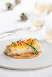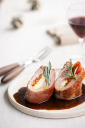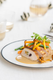 gevulde polderkip met abrikoos, cranberry en pistache, met romige gevogelte jus en cantharellen